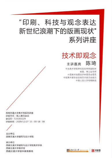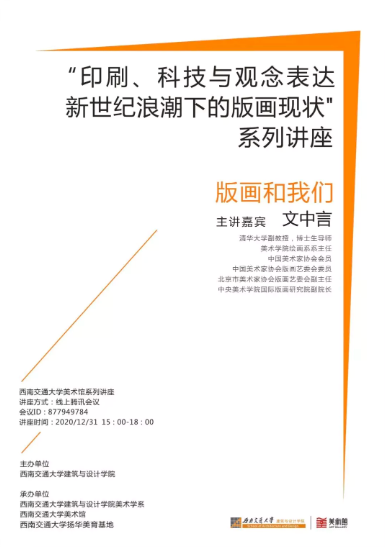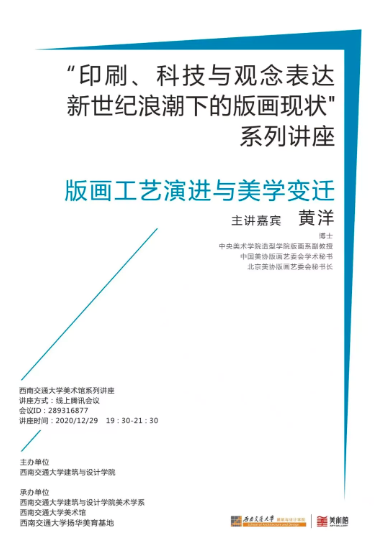 今年与“第五届四川版画提名展”同时举办的四场学术讲座,由西南交通大学建筑与设计学院主办,西南交通大学建筑与设计学院美术学系、西南交通大学美术馆、西南交通大学扬华美育基地承办,以“印刷、科技与观念表达——新世纪浪潮下的版画现状”为学术主题, 着力探索在“后印刷时代”,作为技术、观念的媒介将为作为传统印刷的版画创作带来怎样新的挑战和机遇。