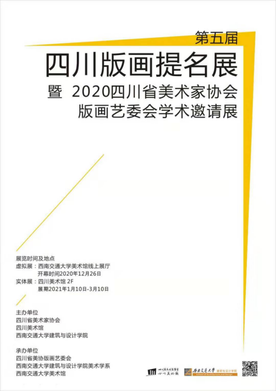 由四川省美术家协会、四川美术馆、西南交通大学建筑与设计学院主办,四川省美术家协会版画艺委会、西南交通大学建筑与设计学院美术学系、西南交通大学美术馆承办的“第五届四川版画提名展”暨“2020年四川省美术家协会版画艺委会学术邀请展”于2020年12月26日在西南交通大学美术馆线上展厅隆重开幕。此次展览展出了包括徐匡、阿鸽、邝明惠、甘庭俭、马力平、贺思恩、崔柏涛等艺术家的80余幅版画作品。本次展览的现场展览将于1月10日在四川美术馆2F展出,并于3月中旬回到西南交通大学美术馆现场再次展出。