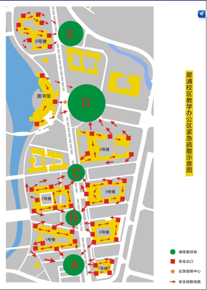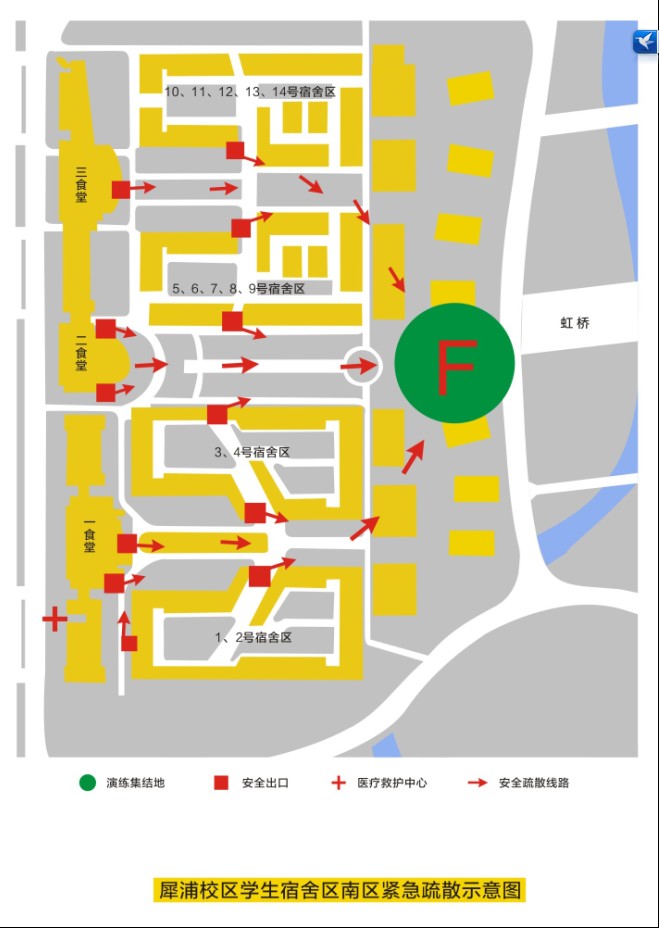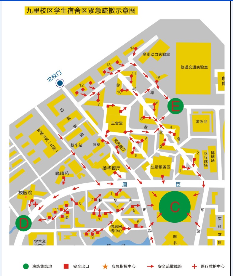 3、学生宿舍园区的同学,演习开始后,在宿舍管理员的引导下从安全出口有序疏散,并按指定路线撤离至集结地。最后离开寝室的同学请锁好门窗。