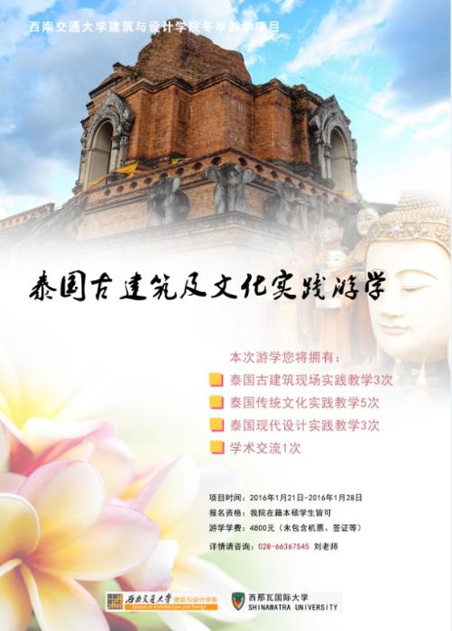 为进一步加强我院学生国际视野,根据西南交通大学建筑与设计学院学生境外留学(游学)计划,现将2015-2016学年度寒假短期赴泰王国西那瓦大学(古建筑及文化实践)游学项目申请及费用安排公布如下(详见附件),欢迎各位同学积极参与。项目联系方式028-66367545 刘老师。
