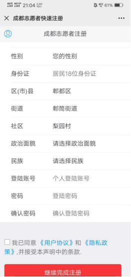 步骤三:填写注册信息。区(市)县“郫都区”。街道、社区(填写志愿服务社区)如,“安靖街道方碑社区”,“安靖街道方桥村”或其他(影响不大)。点击最下方“继续完成注册”。