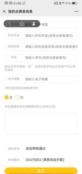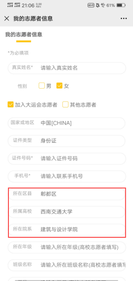 步骤三:填写我的志愿者信息。注:所在区县“郫都区”,所属高校“西南交通大学”,所在院系“建筑与设计学院”。全部填写完成后点击最下方“提交”。
