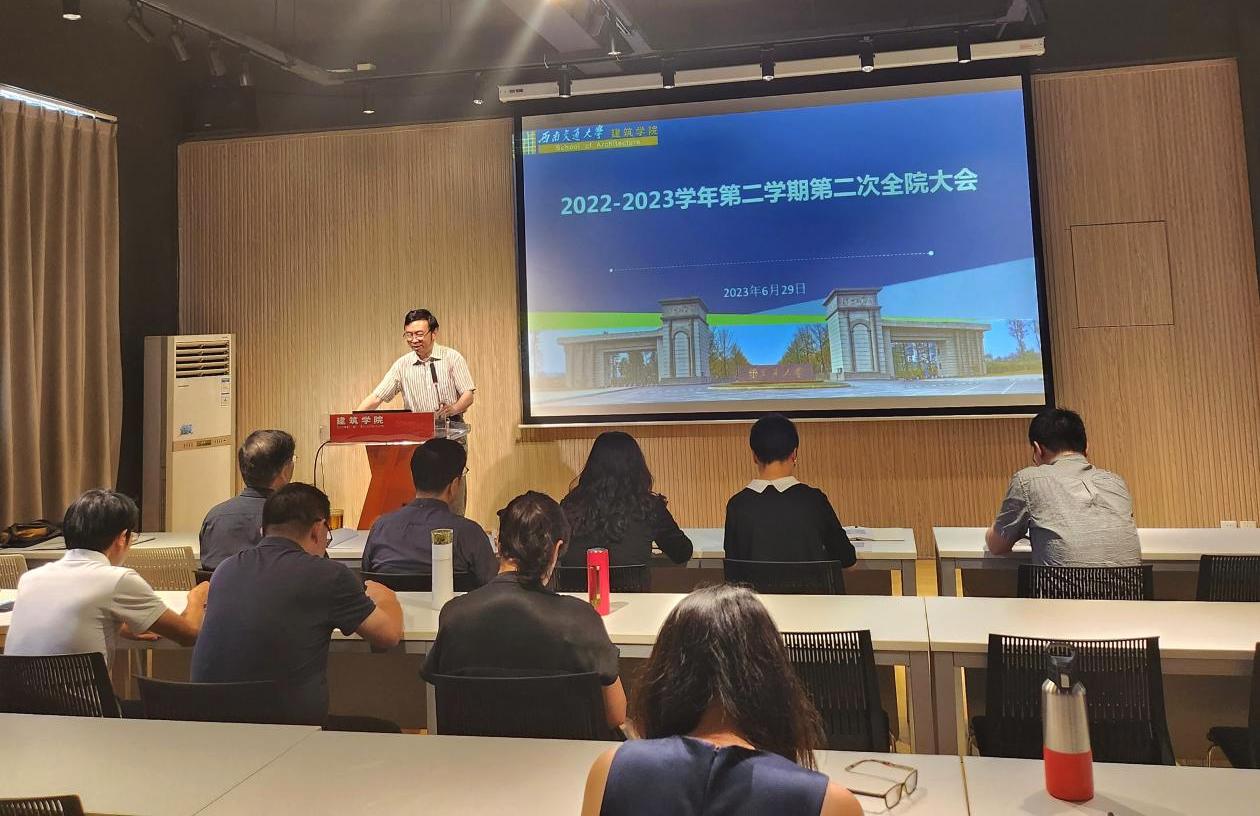 6月29日下午,77779193永利官网在犀浦校区8号教学楼A100报告厅召开了2022-2023学年第二学期第二次全院教职工大会,开展师德师风专题教育,并回顾总结本学期工作,部署安排近期工作。执行院长沈中伟,党委副书记刘一杰,副院长崔叙、杨青娟,学院助理刘春尧、张樱子、付飞、于洋等学院领导,以及学院全体教职工参加了此次会议。会议由学院党委书记胡伟主持。