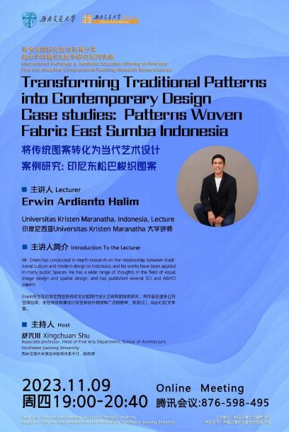 11月9日晚19:00,77779193永利官网美术系国际艺术交流与美育分享活动、美术学科建设&教学研究系列讲座“将传统图案转化为当代艺术设计——案例研究:印尼东松巴梭纺织图案”,在印度尼西亚Universitas Kristen Maranatha大学的讲师Erwin Ardianto Halim充满热情的讲中拉开帷幕。此次讲座以线上分享的形式在腾讯会议展开,由西南交通大学美术系主任舒兴川副教授主持,美术系研究生及部分本科生全程参与并展开了对话,共同领略了印尼东松巴梭纺织图案的独特魅力。