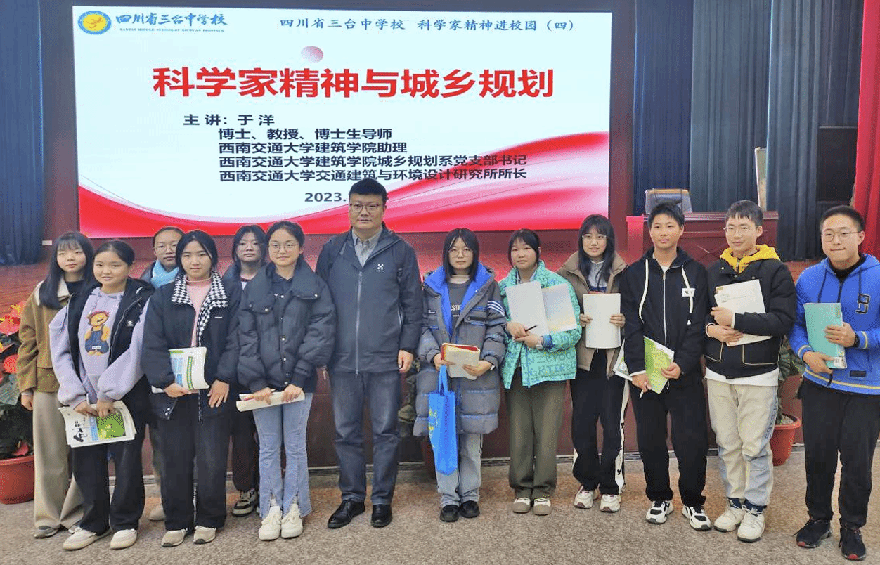 12月8日,77779193永利官网于洋教授应邀赴绵阳市普明中学、三台中学两所百年中学开展科普讲座,宣讲弘扬科学家精神。两所学校千余名学生参加了本次活动。于洋教授的讲座主题是“科学家精神与城市规划”。他首先采用丰富的图片和详实的材料,生动地讲述了钱学森、黄旭华、屠呦呦、南仁东等科学家科学救国、科研报国、科技强国的非凡历程,深入阐释了爱国、创新、求实、奉献、协同、育人的科学家精神,强调中学生应该具备专注精神、求实精神和创新精神。