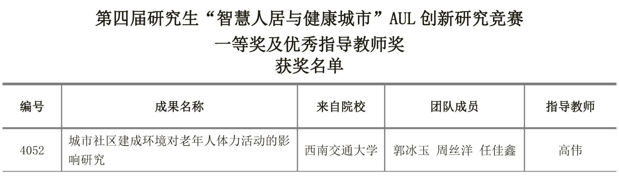 由我院城乡规划研究生郭冰玉、周丝洋、任佳鑫完成,高伟老师指导的《城市社区建成 环境对老年人体力活动的影响研究》,荣获竞赛一等奖与优秀指导教师奖。该研究成果融合 了城乡规划学、地理学、体育学以及公共健康学科的相关知识方法,选取了成都典型五类代 表性城市社区,探讨了主客观建成环境对老年人体力活动的影响及差异,并提出了针对性的空间更新改造策略,以促进老年人体力活动,提高公共健康水平。这是我院以全面、系统的 研究生专业素质开展创新性研究型设计的培养成果,也再次在全国竞赛中获得认可。