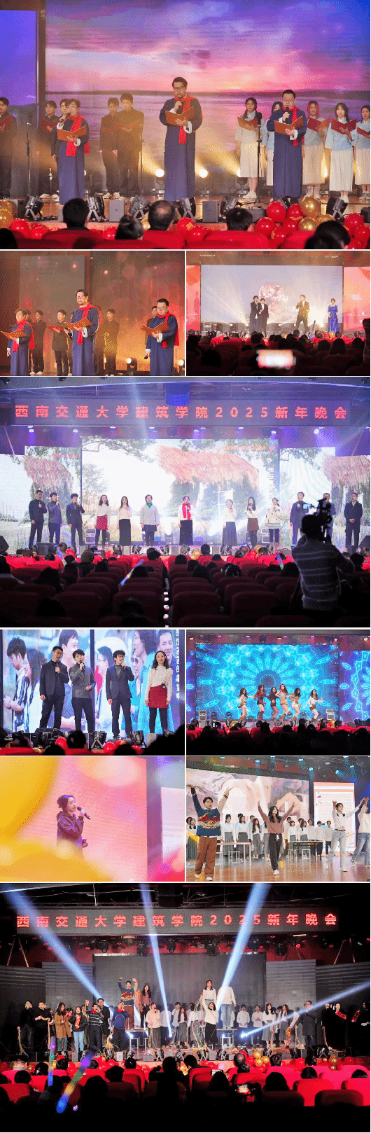 绘画系老师们的诗朗诵《何以华夏 何以中国》气势磅礴,回溯华夏文明,激荡家国情怀。橙・合唱团高歌《灯火里的中国》,雄浑歌声颂祖国昌盛,深情祝福满溢。晚会尾声,学院领导班子与行政人员、学生携手登台,《我和我的建筑梦》唱响师生对建筑事业的赤诚热爱,凝聚奋进力量。