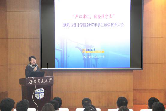 12月21日,我院“严以律己,做合格学生”的2017年学生诚信教育大会在图书馆一号报告厅顺利召开,大会邀请学院党委副书记刘一杰担任主讲,学工组全体辅导员及学院2017级新生级部分其它年级的同学代表参加会议,刘野主持大会。