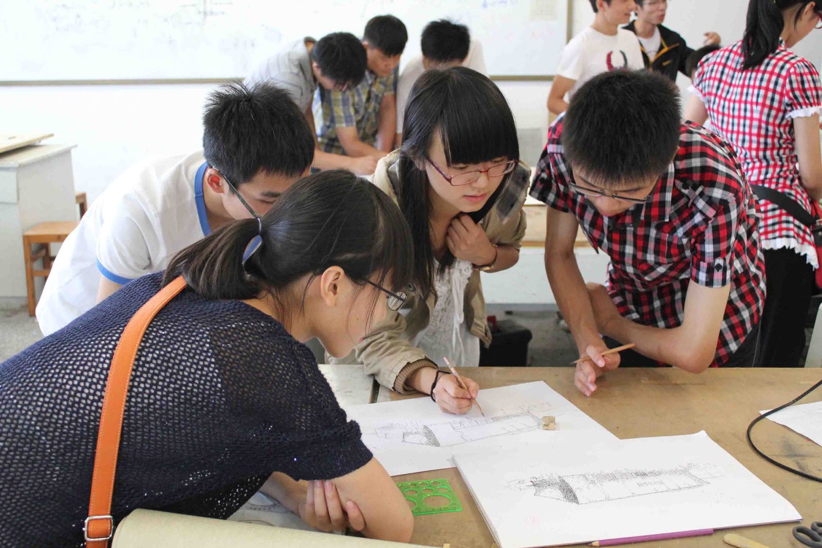 B.:一层大厅——建筑馆与艺传馆廊道——11级景观班——8336——六楼天台——建筑资料室——8339——一层大厅)。16组同学表现十分激动,并且井然有序地排队参赛。每4分钟一组由一层大厅开始活动。