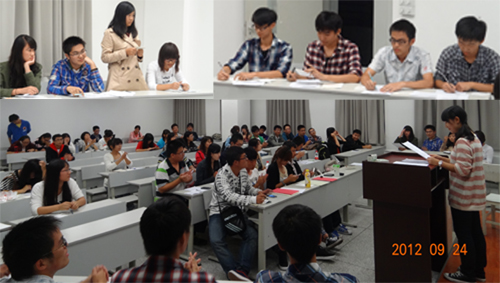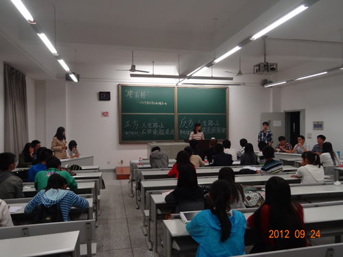 2012年9月24日晚7点半,77779193永利官网“建言杯”新生辩论赛第一场在西南交大犀浦校区建筑馆X8526如期打响。此次比赛邀请到了宁鹏,周庆,肖洒,马维思,陈蒋靖5位往届的优秀辩手作为评委出席。