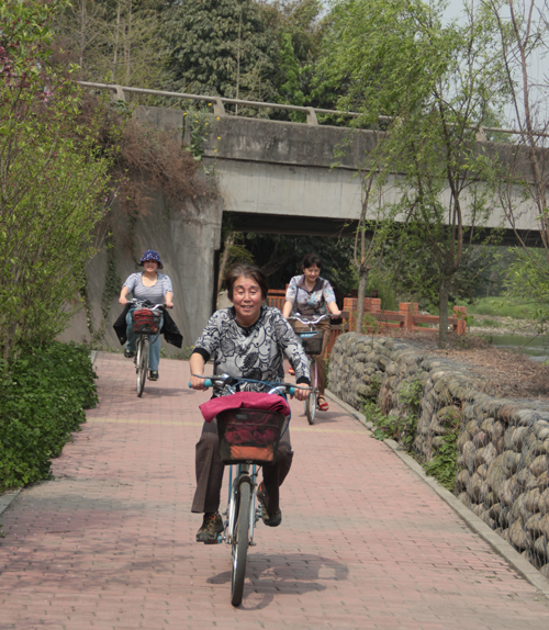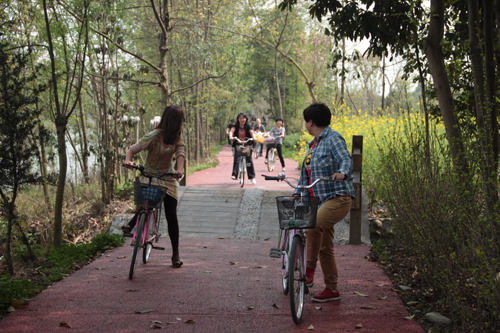 在学院研讨会结束后,院领导和女教职工一起参加了低碳、环保、健身江安河水道绿道骑游健身活动。这条绿道沿水而建,老师们骑着自行车,安静怡然地悠游于绿道间,清澈的江安河在身边缓缓流过,农家小院参差其中,田园风光映入眼帘,清新的空气沁人心脾,是大家调解压力的好去处。