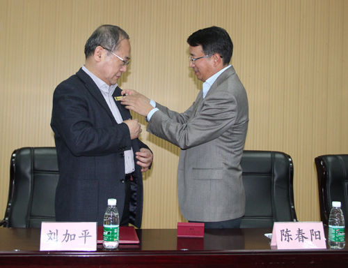 陈春阳校长为刘加平教授佩戴校徽