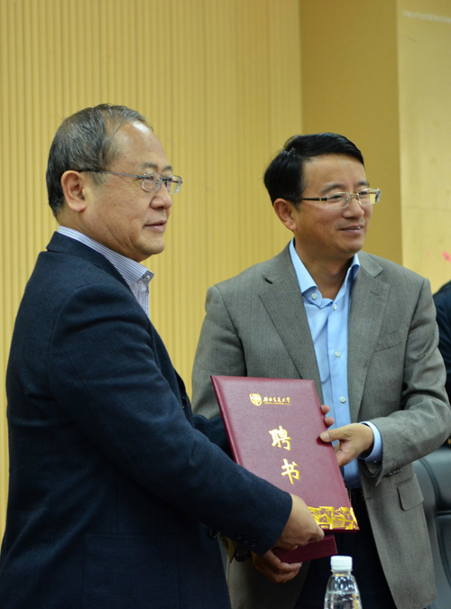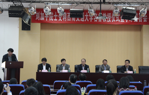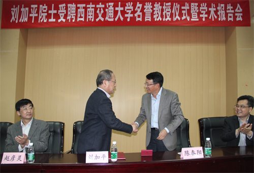 下午3点,报告厅座无虚席,沈中伟院长主持会议,依次介绍了到场嘉宾,并感谢陈春阳校长莅临受聘仪式,聘任仪式上王志杰书记介绍了刘加平院士的学术经历,并盛赞了刘院士的科学成就。接下来陈春阳校长为刘加平院士颁发了名誉教授聘书,并为其佩戴上西南交通大学校徽。陈春阳校长在讲话中表示,西南交大非常欢迎刘加平院士的到来,感谢刘加平院士能够来交大参与工作指导,并表示会为刘院士创造优越的工作条件。