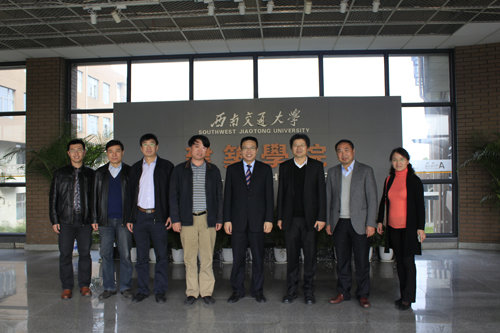2013年11月8日下午2点,西南交通大学徐飞校长一行莅临我院调研检查指导工作。徐校长一行参观了我院办学环境后,在学院第一会议室举行学院工作汇报会议。出席本次会议的领导有西南交通大学徐飞校长、校长办公室主任赵彦灵、教务处处长阎开印、实验室及设备管理处处长冯军焕、研究生院副院长王怀东、科技处副处长祝兵、人事处副处长曾东红、战略发展部学科发展中心副主任庞烈鑫、资产管理处处长助理宋新,我院沈中伟院长、党委王志杰书记等全体领导班子成员,我院教师代表、学生代表参加了会议。会议由学院党委王志杰书记主持。