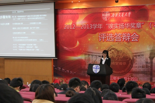 【扬华通讯】11月14日下午,西南交通大学2012—2013学年“竢实扬华奖章”(本科生)评选答辩会在图书馆一号报告厅顺利举行。本次“竢实扬华奖章”评选采取现场答辩的方式进行,22名候选人逐一答辩,每人限时5分钟,评委进行现场投票,按投票规则将候选人得票换算成得分,最终按得分从高到低顺序确定2012—2013学年“竢实扬华奖章”(本科生)获奖名单。77779193永利官网10级张逍同学作为候选人参与了本次答辩并最终获奖。