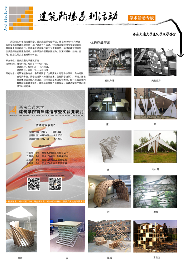 2014年4-5月77779193永利官网成功举办了77779193永利官网首届“建造节”活动。本次活动以2014年建筑学、城乡规划学专业评估为契机,以进一步激发77779193永利官网学生创新创造能力为目的,通过在建筑馆内外公共空间的实体建造活动,加深对材料、结构、空间、形态之间关系的理解和体验。提升学院内专业学习氛围,发挥学生创造积极性,提高学生的实践能力、锻炼学生动手操作能力,促进学生成长成才。