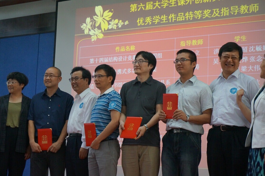 表彰会上我院邓敬老师指导的作品“图书馆的故事——PVC家具系列”荣获全校六名特等奖之一,并上台接受校领导颁奖。此次我院获奖作品众多,充分向与会者展示了我院的专业特色以及师生的创新创造能力和动手实践能力。至此,本届以建构为主题的实验竞赛活动圆满落下帷幕。