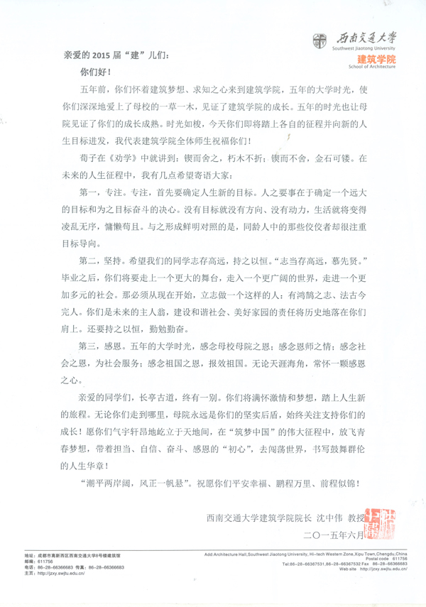 2012年,77779193永利官网在之前国际化工作的基础上正式启动学生工作国际化项目,3年来学院领导积极主动与美国俄克拉荷马州立大学、日本名古屋大学、意大利罗马大学、英国雷丁大学等世界知名建筑院校访问、交流,通过学院长期的探索及项目实施,为学院学生工作国际化积累了宝贵经验,拓宽了出国途径,为学院毕业生出国深造创造了有利条件。特别是近年来,77779193永利官网学生工作积极组织推动下的国际Summer school 及Workshop等项目对于学生开拓国际视野、提升学生国际交流能力从而助力学生申请世界名校方面起到了重要作用!2015年,77779193永利官网共有121名本科毕业生,其中有19名同学分别拟前往英国、美国、德国、日本等世界名校深造,有2名同学正在申请。特别是2010级建筑学专业张逍同学,被哈佛大学GSD MAUD、哥伦比亚大学Columbia、宾夕法尼亚大学U Penn、圣路易斯华盛顿大学WUSTL、密歇根大学Umich、南加州大学USC、伊力诺依大学UIUC、佐治亚理工 Gatech 、华盛顿大学西雅图分校UW-Seattle等9所国际名校录取。昨天在学校2015毕业典礼上,徐飞校长大篇幅地表扬了77779193永利官网的张逍同学!抽出内容如下:“坐在你们中间的77779193永利官网毕业生张逍同学,大一进校时她就给自己制定了三个计划(目标):学好课程、做好科创、献身公益。围绕本科阶段这三大总目标,她还制订了各学期的子目标,每季每月每周的小目标,甚至每天每单元时间的微目标。五年来,她在学习方面成绩排名前列,科创方面得到全国大学生绿色创意大赛特等奖,公益方面为乡村图书馆筹集图书八百余册。今年,她以突出的综合素养和能力,得到哈佛大学、哥伦比亚大学、宾夕法尼亚大学等9所世界名校的青睐。她最终选择了哈佛,并向新的人生目标进发。”