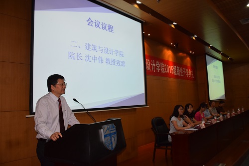 沈中伟院长首先代表全院师生员工,向2015级新生表示热烈的祝贺和欢迎,同时也向精心培养学生的老师和家长致以诚挚的感谢。简要介绍了建筑与设计学院的历史、发展及近年来取得的成就。随后沈院长就同学们如何充实而有意义地度过大学生活,提出了几点建议与2015级新生分享。