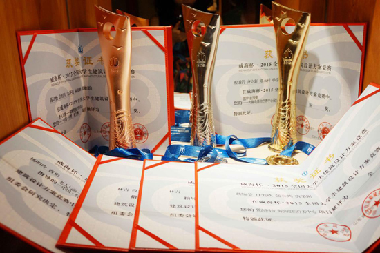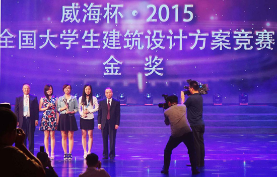 2015年9月,由中国建筑学会、山东省住房和城乡建设厅、威海市人民政府联合主办的“威海杯·2015全国大学生建筑设计方案竞赛”中,我院学生:耿婉莹、母爱欣、唐肇彬、蒲春芃共同完成作品《疍海同舟——海滨度假疗养中心》获得金奖;蒋诗怡与台湾中华大学同学共同完成作品《中国•台湾•南方澳——滨海度假疗养中心》获得银奖;程秉钤、齐立轩、谭永祥 、单涤非的参赛作品《彼岸 故园情——大陈岛原住疗养中心设计》获得铜奖;屠超、韩照、文君的作品《归泊——海滨度假疗养中心》获得优秀作品奖。