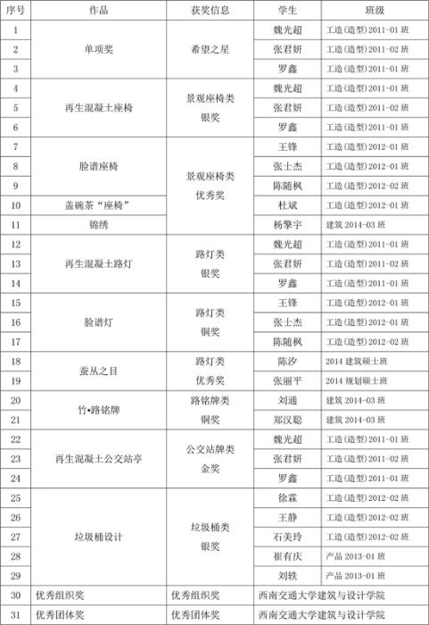 据悉,本次比赛由天府新区成都管委会规划建设局主办,成都天府新区规划设计研究院承办,首届主题是城市家具创意设计。我院学生积极参赛,历经30余位知名设计行业专家的两轮评审以及网络投票、主办方评定等评审环节,我院共获得希望之星一项、金奖一项、银奖二项、铜奖四项、优秀奖四项,同时,也为我院争得“优秀组织奖”及“优秀团队奖”(获奖名单后附),是本次比赛获奖最多的高校之一,这反映了我院学科发展的水平正不断提高,同时,也为扩大我院的社会声誉提供了有力的支持,祝贺获奖选手。