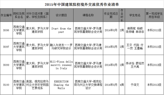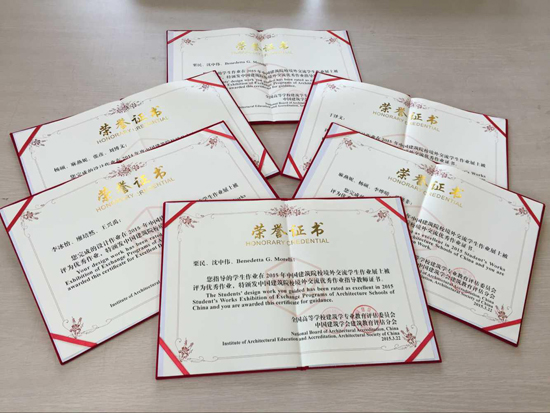 2015年3月, 在中国建筑院校境外交流优秀作业评选中,经全国高等学校建筑学专业教育评估委员会、中国建筑学会、中国建筑学会建筑教育评估委员会评选,我院4份作业获评2015年境外交流优秀作业。评选中我院学生:麻燕妮、杨硕、李烨晴、单涤非在意大利罗马大学77779193永利官网共同完成的《Start from the past》;王贝、代阳、付一然、王墨瀚在意大利罗马大学77779193永利官网共同完成的《融入与迸发——罗马研究学院设计》;李冰怡、廖培然、王兴禹在意大利罗马大学77779193永利官网共同完成的《HillPizza della moretti renewal in Italy》;于泽文在美国俄克拉荷马州立大学农学院园艺景观系完成的《EXHIBITION Shaping the Walls》获评2015年境外学生优秀作业奖。