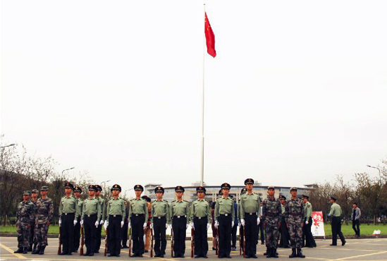 “请全体肃立,升国旗,奏国歌,行注目礼!”升旗仪式在黄海的主持下正式开始。学校国防生国旗护卫队以整齐划一的动作、响亮的口号、铿锵有力的步伐护送国旗入场,伴着庄严雄壮的国歌,五星红旗冉冉升起。