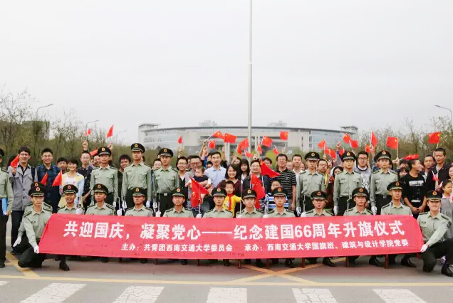 为了庆祝建国66周年,加强对师生的爱国主义教育,2015年10月1日早晨8:00,建筑与设计学院100余名师生党员在西南交通大学犀浦校区参加了“共迎国庆 凝聚党心”---纪念建国66周年升旗仪式暨党员宣誓仪式。西南交通大学校团委朱剑松书记、建筑与设计学院党委栗民副书记、学生工作处沈哲老师等出席本次仪式。