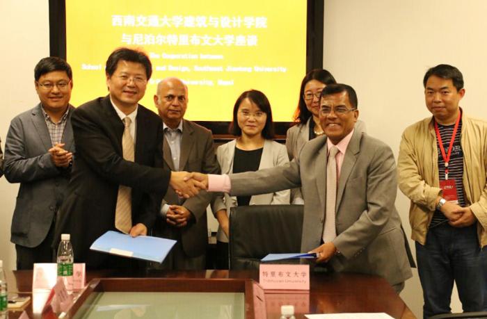 2015年10月17日下午3点半,西南交通大学建筑与设计学院同尼泊尔特里布文大学工学院签订了合作备忘录。建筑与设计学院沈中伟院长、党委栗民副书记、院长助理崔叙教授、杨青娟副教授、刘春尧副教授、学院世界遗产中心张宇副主任等与来访的特里布文大学工学院Tri Ratna Bajracharya院长和Sudarshan Raj Tiwari教授进行了会谈。