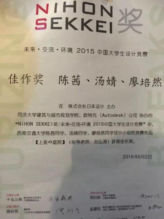 近年来,西南交通大学建筑与设计学院注重拓宽学生学习视野,加强跨国际文化交流,多次组织暑寒假游学活动,带领学生前往日本、意大利等国家领略不同文化,感受不同思维的碰撞。此次获奖的汤婧等同学于2015年参与了栗民书记、刘弘涛老师指导的日本暑期Workshop。参赛学生的设计灵感来源于日本暑期Workshop的所见所感。
