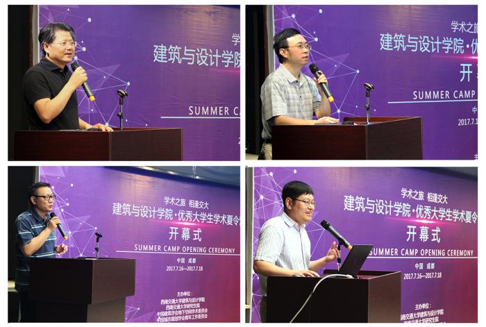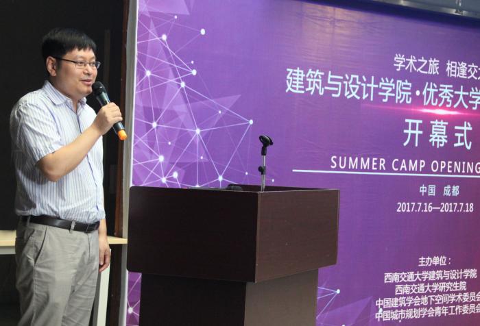 建筑与设计学院院长、党委书记沈中伟教授致欢迎词,代表学院全体老师欢迎嘉宾的莅临和学子的到来。他强调:学院给大家提供了优秀的资源、邀请国内外各领域知名专家学者为大家带来丰富的学术活动,衷心祝愿学子们能够有所收获。中国城市规划学会青年工作委员会副主任黄建中指出,此次夏令营活动形式多样、内容丰富,以展示营员能力、激发设计创作兴趣为宗旨,同时较好地传播研究生教学科研理念,希望各位学员能够满载而归。西南交通大学研究生院院长助理胡伟为学院第一届夏令营的成功举办表示祝贺,并且告诉学子们西南交通大学研究生院始终致力于研究生培养质量的提高,着力培养拔尖创新人才,欢迎各位学子来到交大深造学习。副院长崔叙教授主持了开营仪式。