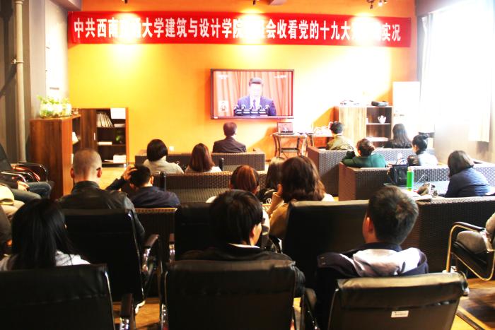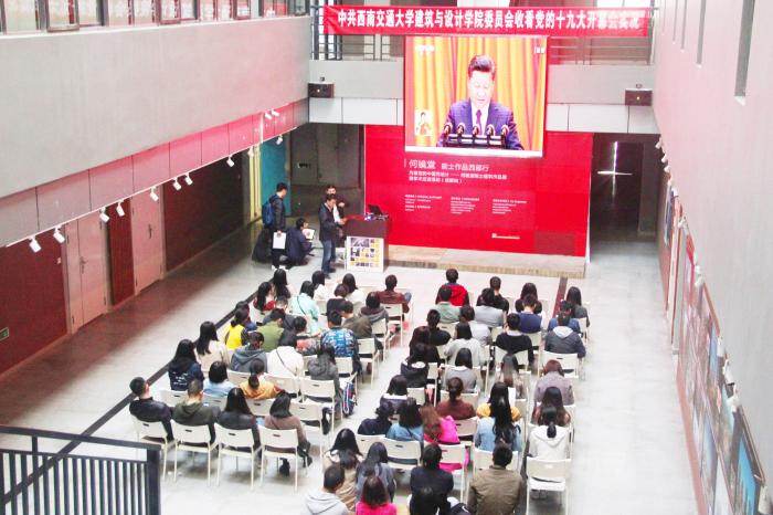 2017年10月18日,中共西南交通大学建筑与设计学院委员会于西南交通大学建筑与设计馆组织集中收看党的十九大开幕会实况。建筑与设计学院党委成员、教师党员、辅导员、学生党员代表约100余人参加了此次集中收看活动。