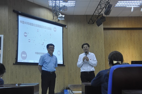 林纪总规划师在报告中,以起步期、起飞期、繁荣期、新时代四个篇章,回顾了40年来中国城镇化和城乡规划事业发展的重要标志性节点。对照从党的十一届三中全会直到十九大,党和国家重要理论思想的发展演进,重点阐述了城乡规划工作如何在党的领导下,积极对接国家发展战略,服务和推动城镇化。在对于新时代城镇化发展和城乡规划事业进步的解读中,林纪总规划师特别分析刚刚公布不久的雄安新区规划方案提出的 “世界眼光、国际标准、中国特色、高点定位”的规划原则,他热情地与师生分享了他的解读:承担着“千年大计、国家大事”这一历史使命,雄安新区将是新时代社会主义现代城市的标杆,未来成为共产主义理想城市的试验田。