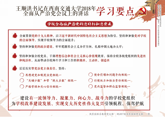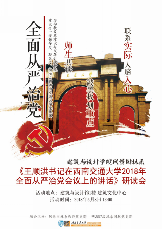 为响应学校改革建设与发展,更好地建设“具有一流领导力、凝聚力、向心力”的基层党组织,风景园林系教师党支部联合研2017级风景园林党支部,于5月8日共同举办了学习王顺洪书记《全面从严治党,建设有一流领导力、凝聚力、向心力的西南交通大学党组织,为学校改革建设与发展引航护航》讲话研读会。