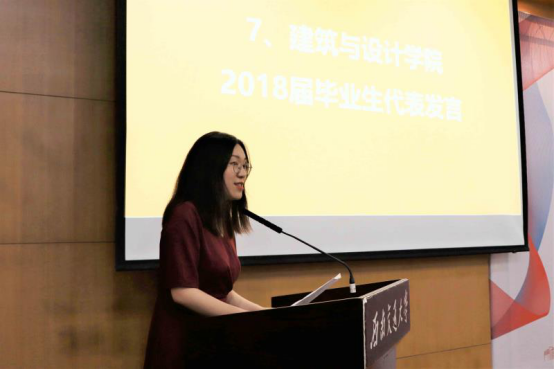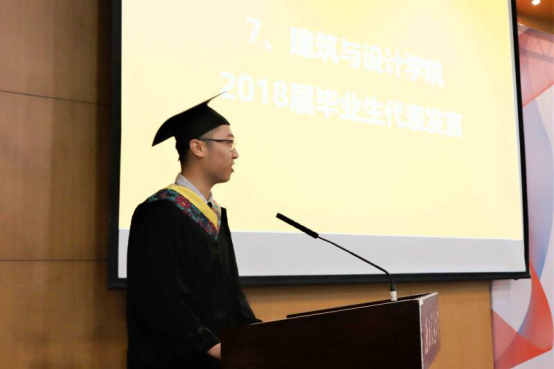 随后,研究生毕业生吴彦妮作为学院2018届毕业生代表发言,感谢了所有支持她的同学、老师和学校,表达了她对大家的祝福。本科生毕业生范正午作为学院2018届毕业生代表发言,表达了这些年在学校不断学习、不断成长的感想。
