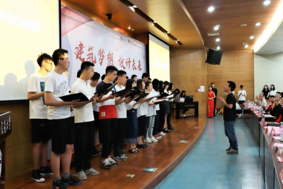 最后我院橙合唱团为毕业生献唱《大鱼》及《那些花儿》随着歌声同学们挥舞着自己手机的电筒,为所有毕业生祝福,全体合唱校歌《文轨车书郅大同》。在热烈的欢呼声和鼓掌声中,建筑与设计学院2018届毕业典礼暨授位仪式圆满落下帷幕。
