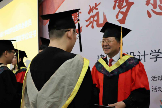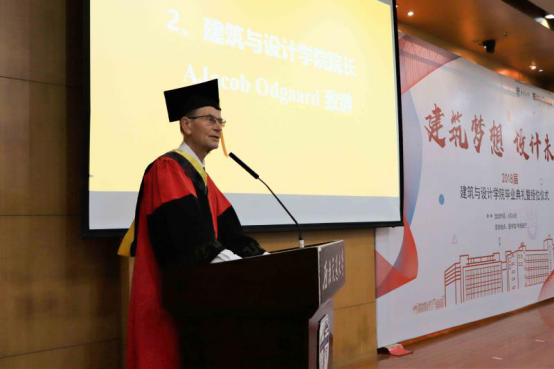 学院党委书记沈中伟教授、院长AJacob Odgaard教授、副院长支锦亦教授、副院长崔旭教授、副院长杨青娟教授,院长助理刘春尧副教授,各系党支部书记,各系主任、副系主任,以及学位评定分委员会委员出席了典礼。参加典礼的还有300余位毕业生及其亲友团。仪式由建筑与设计而学院党委副书记刘一杰主持。