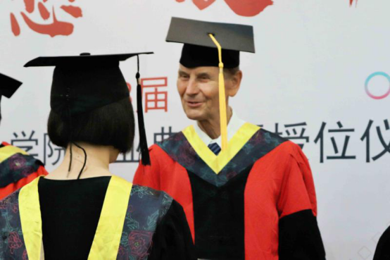 在全体起立奏唱国歌后,院长AJacob Odgaard首先上台致辞。他首先祝贺各位毕业的同学成功迈向了人生的新篇章,他为他们每个人都感到十分骄傲。他希望同许们在取得一定成就后,仍不忘初心,继续追求。他从自身经验出发,为我们提出了几点宝贵的意见:”whatever you do,remember to make the world a better place not only for you and your family,but everybody.”、”try to better than your own models”、”have compassion”。