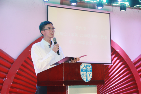 2018级研究生新生李渊作为研究生代表进行了发言,他的发言有三个主题:感谢痛苦、感谢团队、勇于奉献。他就自己的人生经历与大家分享了这三个主题的人生经验。