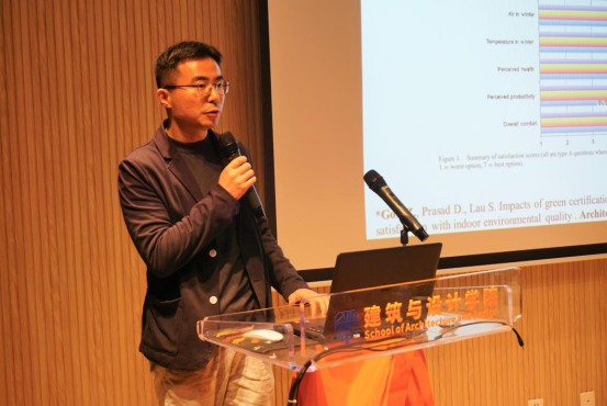 随后,论坛进入主题报告阶段。苟中华博士以“以人为本的建筑物理环境设计研究”为主题,分别从国内外绿色建筑现状和发展、高密度城市热岛效应、城市微气候等方面进行了精彩的分享。杨林川博士以“提升老年人移动性的公共交通政策措施研究”为主题,结合自身在中国香港地区做的研究阐述了以长者友好的交通构建长者友好的城市展望。韩俊博士以“低碳建筑围护结构的热性能的数值模拟研究”为主题,将其在动态热性能模拟、流体动力计算等方向的研究进行了分享。吴永萌博士将其“基于创造式沉浸体验的音乐交互界面的设计及评估”的研究与参会人员进行了展示与解读。张坤博士则以“古代传统有机-无机复合灰浆的多学科交叉研究”为主题,分享了在建筑遗产保护领域中充分发挥多学科交叉视角下的有机-无机复合灰浆的研究内容。