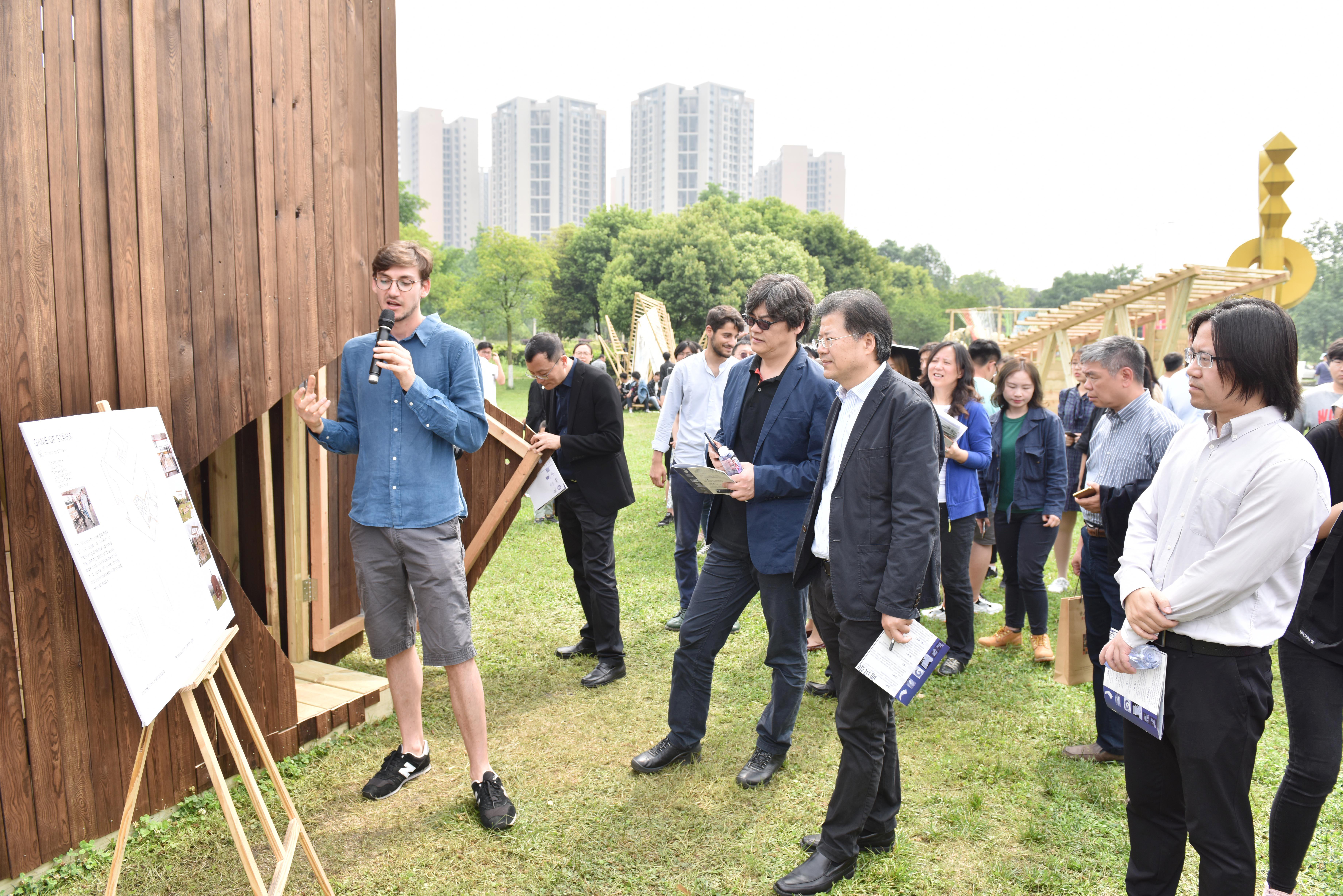 开幕式结束后,各位专家带领我们揭开每个参赛作品的神秘面纱,张伶伶教授等评审专家对此次参赛作品发表了精彩点评,专家评审团队对跨学科和国际化方面的成果予以充分肯定。他们对建造作品给予了高度评价,认为本次建造节的参赛作品创意十足,精彩地诠释了主题表达和材料运用,优秀的作品充分体现了此次国际建造节所要求的独创性与设计逻辑。在精彩点评环节之后,大赛在建筑组和通识组中评选出了一等奖两组、二等奖四组、三等奖八组、优秀奖九组和特别鼓励奖一组,其中米兰理工大学的作品《Game of Stairs》获得一等奖,受到专家组一致好评。