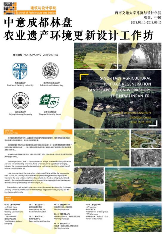 2019年6月10日-15日,中意成都林盘农业遗产环境更新设计工作坊由西南交通大学与意大利米兰理工大学、日本名古屋大学和北京交通大学国内外四所优秀高校师生联合成功举办。该工作坊旨在探讨在乡村振兴背景下如何改善和提升林盘生活环境的合理方法,同时也是我院推进设计课程教学国际化的重要环节,促进多校师生相互交流学习。