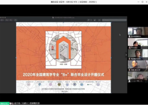 “大健康”联合毕设组利用ZOOM平台,以《成都城厢古镇全龄健康社区营造与单体建筑设计》为题目进行网络开题,参与院校有北京建筑大学、大连理工大学、东北大学、哈尔滨工业大学、河北工业大学、华中科技大学、清华大学、沈阳建筑大学、天津大学及我校,共计七十多名师生参加;“8+”联合毕设组利用腾讯会议平台,以《伸延——成都宽窄巷子二期工程城市设计+建筑设计》为题目,参与院校有清华大学、东南大学、同济大学、天津大学、重庆大学、中央美院、厦门大学、北京建筑大学及我校,共计一百七十余师生参加;西部四校联合毕设组以《简州新城沱江中轴城市设计》为题目,参与院校有西安建筑科技大学、昆明理工大学、四川大学及我校,共计一百多名师生参加。