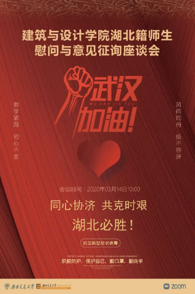 2020年3月14日上午10点,一场特殊的“云会议”在建筑与设计学院师生间召开。建筑与设计学院党委书记吴晓雄、执行院长沈中伟、党委副书记刘一杰、副院长崔叙、副院长杨青娟、湖北教师代表、全体辅导员以及湖北籍学生代表参加了本次慰问会议。此次慰问会议的目的是要对湖北籍师生们表达问候和关心,进一步了解大家的现状和困难以及听取大家对学校、学院的建议和意见,同时,会上传达了西南交通大学副校长姚发明对湖北籍师生们的牵挂和祝福,以及对同学们就业等问题的着重关怀。