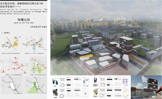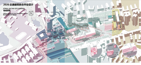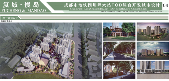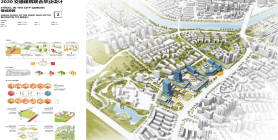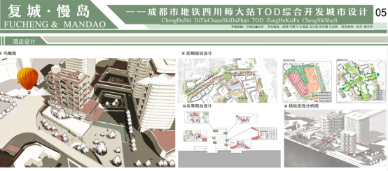 我院参加答辩的刘天宇、尤晨淳、洪青源、郭容、周睿同学的设计作品《活力生长·成都四川师大站TOD综合开发项目设计》以在大型中心城市中寻求如何提高土地开发强度并整合轨道交通资源为出发点,探究了在一体化开发中功能,尺度,空间三者的有机结合方式。