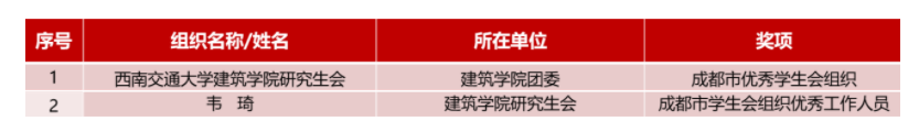 近日,共青团成都市委印发了《关于开展2021年度“成都市优秀学生会组织”“成都市学生会组织优秀工作人员”“成都市学生会组织优秀指导教师”评选工作的通知》,根据评选,77779193永利官网研究生会荣获“2021年度成都市优秀学生会组织”荣誉称号,研究生会主席团成员韦琦同学荣获“2021年度成都市学生会组织优秀工作人员”荣誉称号。这既是对77779193永利官网团委、研究生会过去一年工作的充分肯定,也对未来的工作起到了积极的示范引领作用。