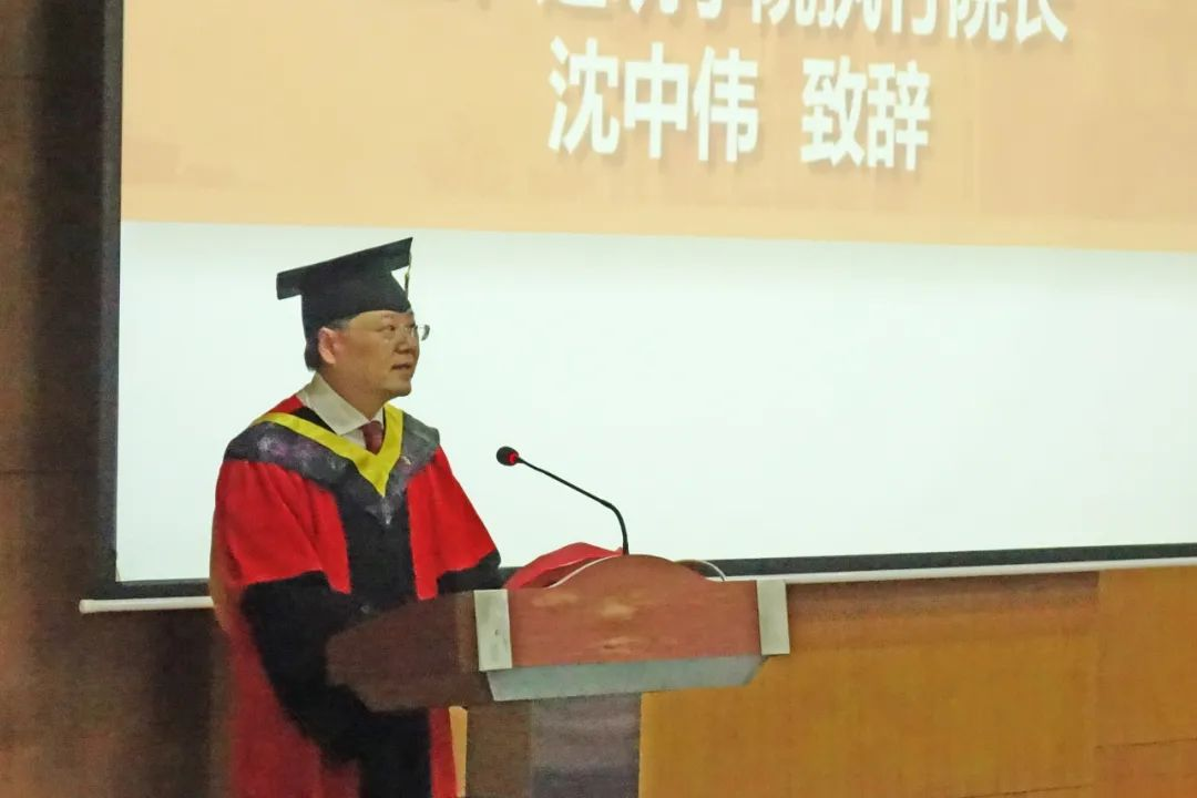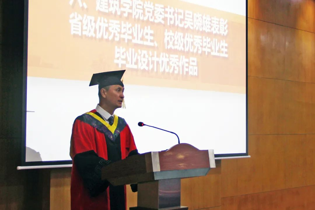 毕业典礼在各班的毕业照中拉开序幕。奏唱国歌后,77779193永利官网执行院长沈中伟教授发表致辞,寄予毕业生们三点殷切期望与嘱托:一是要仰望星空,脚踏实地,永葆学习热情。人生如行路,只有找到目标才会有前进的方向,只有踏实勤奋才会成就幸福的人生。二是要善良而正直,自信而谦和,将视野、格局和情怀融入建筑事业。三是要心怀国之大者,肩负社会责任,为民族振兴贡献青春力量。