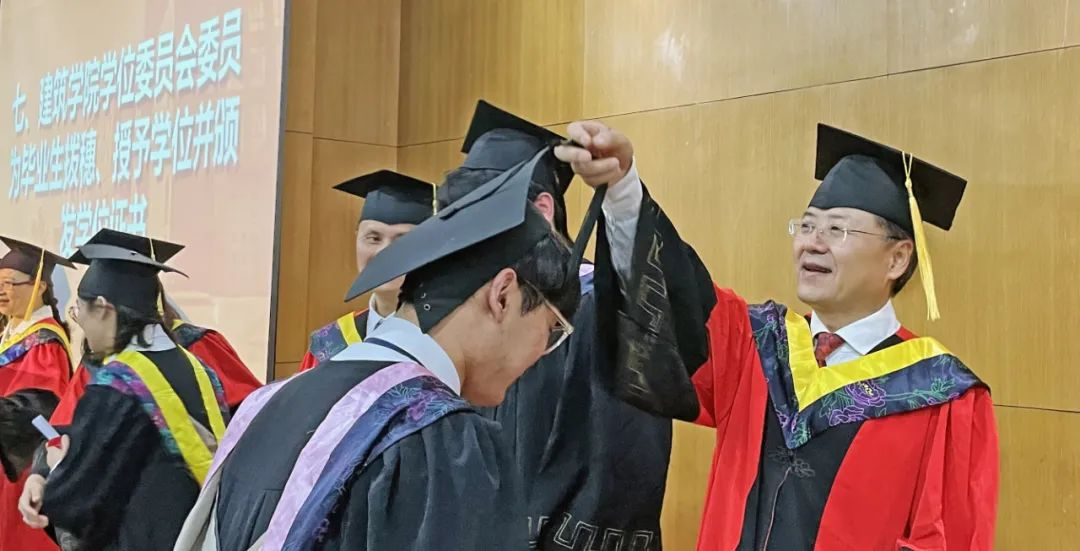 在高亢的音乐声中,学院学位评定分委会委员为毕业生拨穗、授予学位,并合影留念,将典礼的气氛推向高潮。