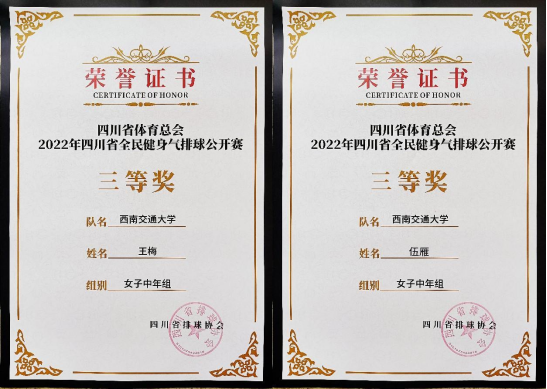 2022年12月11日,由四川省体育总会主办、四川省排球协会承办的2022年四川全民健身气排球公开赛经过两天的激战顺利闭幕。共有四川省内各地市州的30支球队近400多人参加了本次比赛。77779193永利官网王梅、伍雁老师代表学校参赛,荣获三等奖的好成绩。