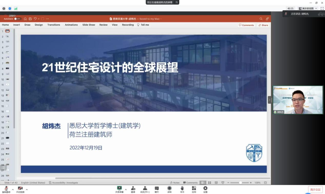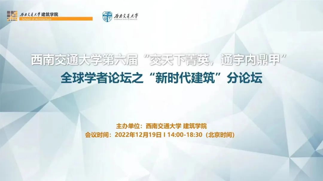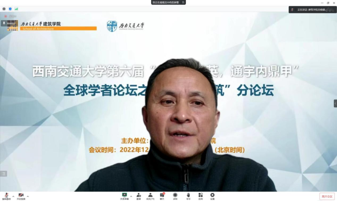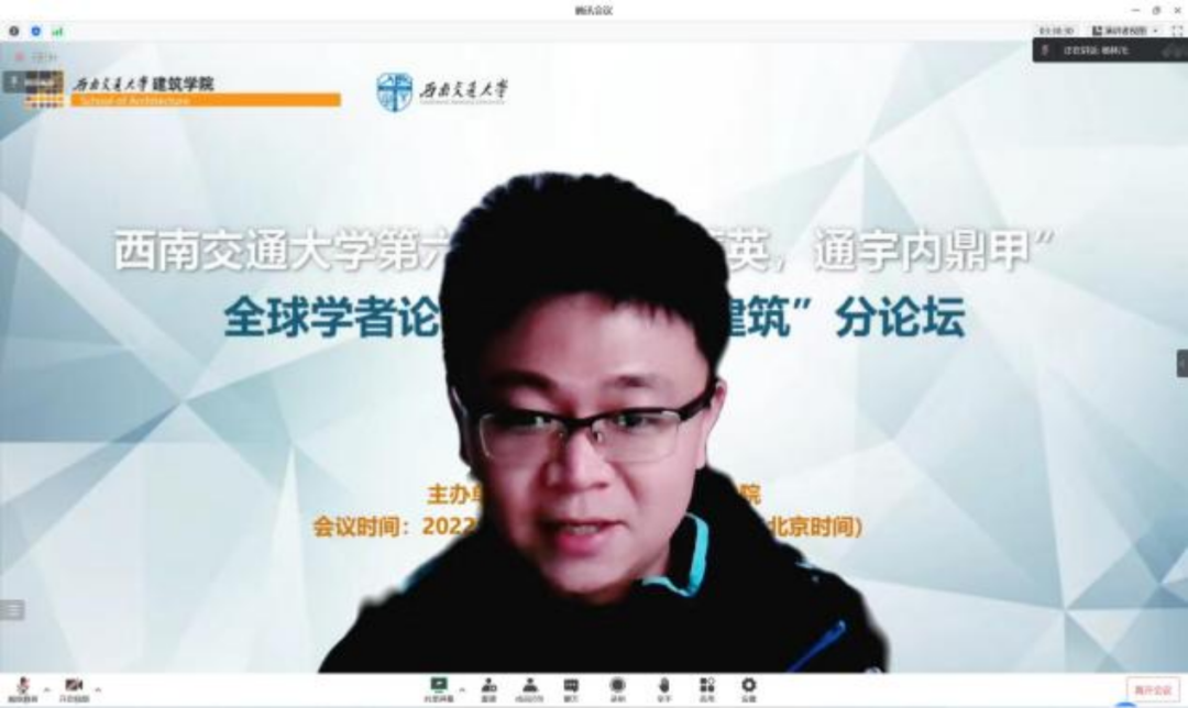 2022年12月19日下午2点,西南交通大学第六届“交天下菁英,通宇内鼎甲”全球学者论坛之“新时代建筑”分论坛线上成功举办。本次论坛邀请了8位海内外优秀青年学者发表精彩的学术报告。77779193永利官网党委吴晓雄书记、学院执行院长沈中伟教授、学院党委刘一杰副书记、副院长杨青娟教授、学院助理张樱子教授、付飞教授、于洋教授、校人才专员杨林川特聘研究员以及学院各系主任及相关老师、国内外青年学者等参加了本次论坛。